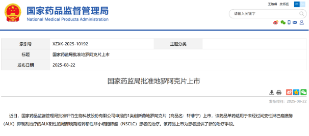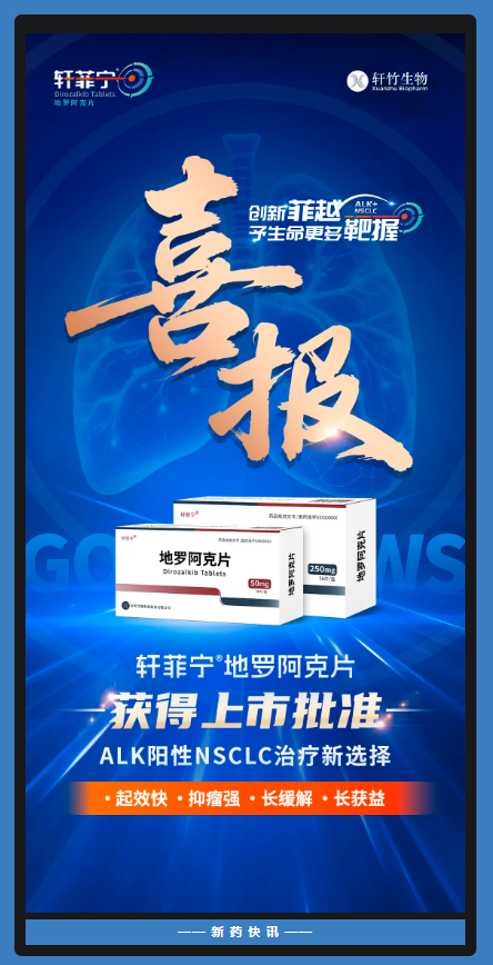 2025年8月22日,轩竹生物科技股份有限公司自主研发的1类创新药“地罗阿克片”(商品名:轩菲宁®)正式获得中国国家药品监督管理局(NMPA)批准上市,用于间变性淋巴瘤激酶(ALK)阳性的晚期非小细胞肺癌(NSCLC)患者的治疗。作为轩竹生物首个获批的肺癌靶向创新药,地罗阿克以起效快、抑瘤强、长缓解、长获益的突破性疗效,为晚期耐药及脑转移患者提供全新解决方案。