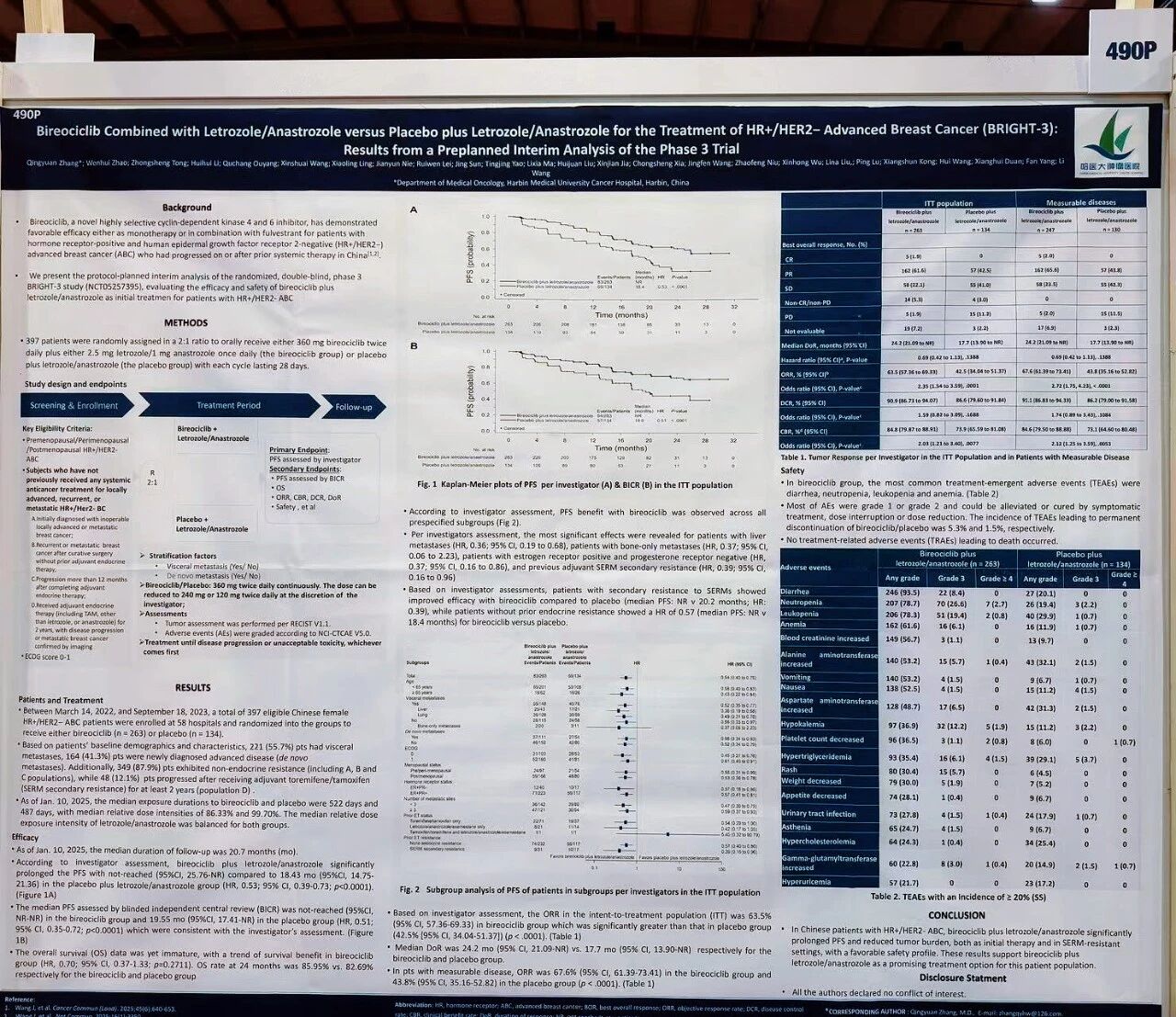 2025年10月20日,德国柏林——在2025年欧洲肿瘤内科学会(ESMO)年会上,由哈尔滨医科大学附属肿瘤医院张清媛教授领衔的III期BRIGHT-3研究(NCT05257395)公布了预设期中分析结果(490P)。该结果标志着轩竹生物自主研发的新型CDK4/6抑制剂吡洛西利在HR+/HER2-晚期乳腺癌一线治疗中取得重大突破。