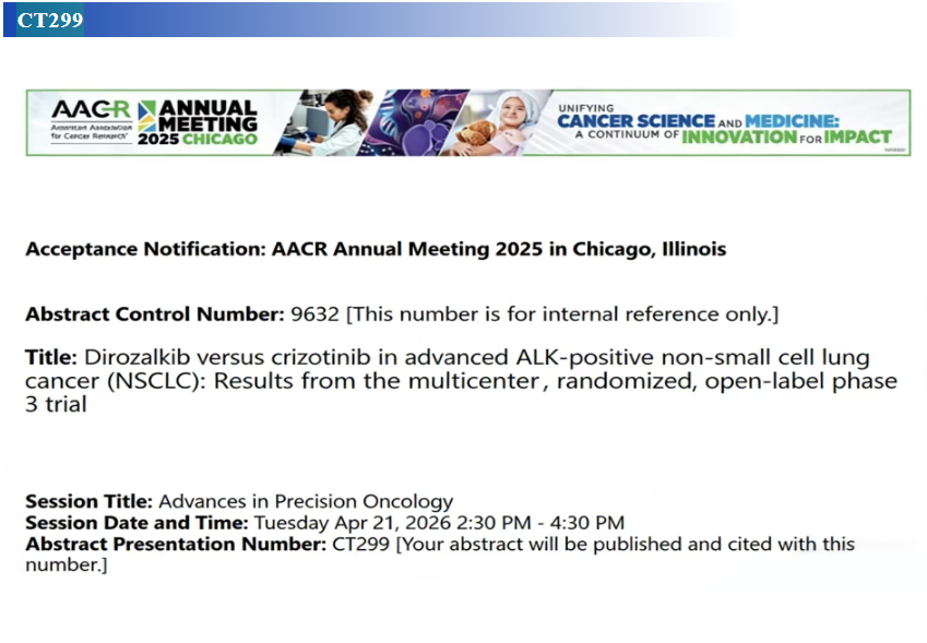 本届AACR年会,轩竹生物将携多项重磅成果高光亮相。其中,核心产品地罗阿克(Dirozalkib)一举斩获1项口头报告与1篇壁报。作为新一代ALK抑制剂,地罗阿克在ALK阳性局部晚期或转移性非小细胞肺癌(NSCLC)患者中,展现出卓越的疗效与优异的安全性,备受期待。另一款明星产品吡洛西利(Bireociclib)同样入选1篇壁报,作为国内首个获批上市的CDK2/4/6抑制剂,吡洛西利在HR+/HER2-晚期乳腺癌治疗中,持续彰显出显著的临床获益。地罗阿克与吡洛西利将在2026年AACR年会上联袂登场,精彩表现,值得期待!